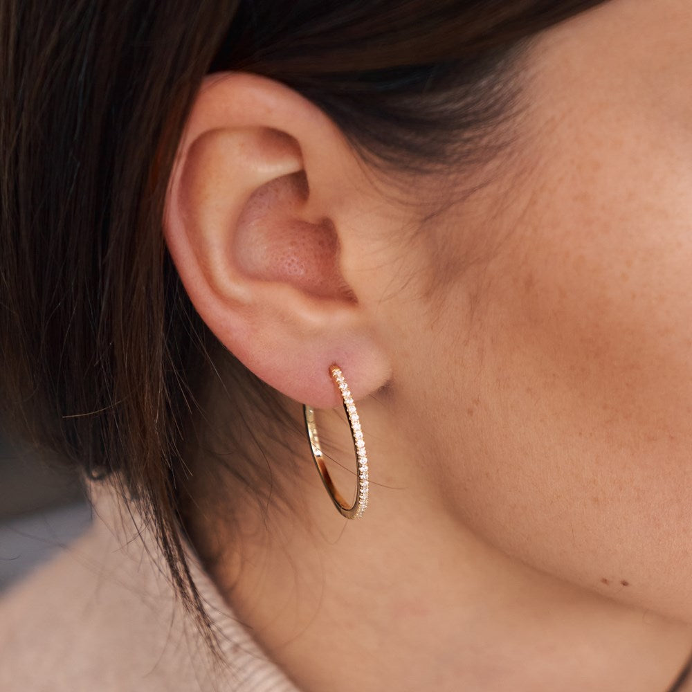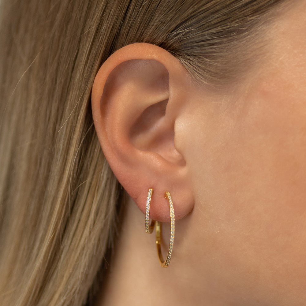 Nice and elegant hoops with cubic zirconia with a smart lock mechanism. It’s a classic click-lock that via a stud is gently clicked together.