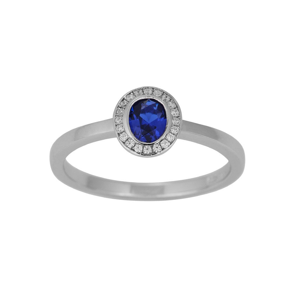 Rh. Silver rosette ring synthetic. 4x5mm Sapphire + cz