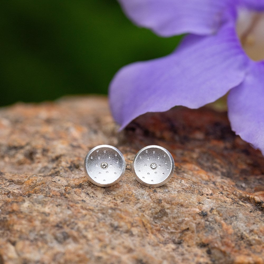 En gnist og shimmer, der minder om en stjernehimmel, møder en rund, indadbuet form: Disse håndlavede øreringe lavet af sandmattet 925/- sterling sølv med en brillantsleben diamant arrangeret i midten (0,02 ct i alt) og en specialbearbejdet overflade er et rigtigt blikfang på øret. Fås med matchende vedhæng og ring.