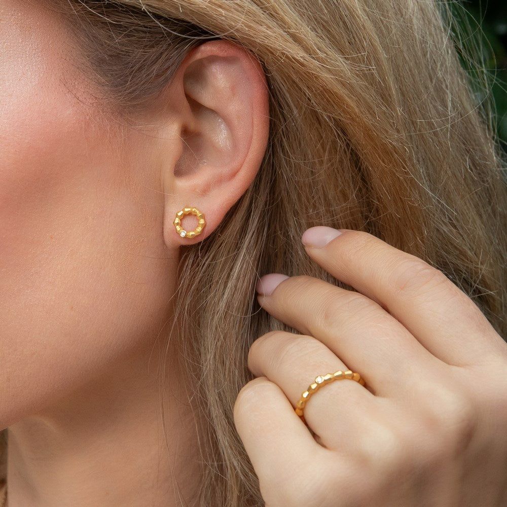 En gennemgående karakteristisk overfladestruktur møder en funklende diamant med 0,02 ct. Den særlige fornemmelse, der kommer af designet, gør smykket til et rigtigt blikfang. Denne ring er designet af Thomas Mayer, som altid giver et frisk pust med sin egen signaturstil. Fås med matchende vedhæng og matchende øreringe.